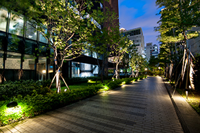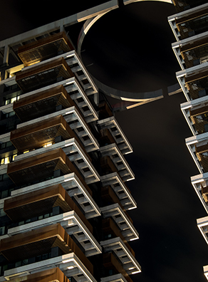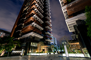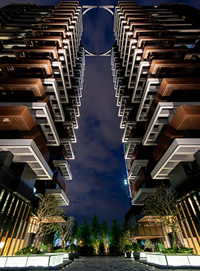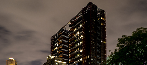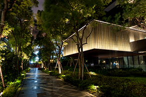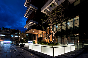 宝徕花园位于新店小巷内新建案,面临宝桥路及近邻七张捷运站。灯光主要强调立面格栅材质感。应用不规律的点灯动态,在远方突显出建筑量体的节奏感,在人行尺度强调宝徕花园的格栅角隅投光,呈现格栅之美感。