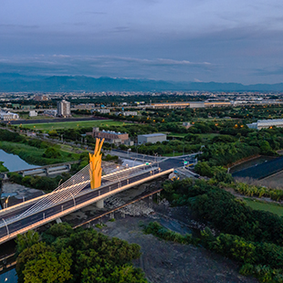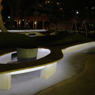 川 的意象—川字為源,取其川流不息之意。象徵都市之人來人往。整體公園的色溫配置主要分為三種,實木座椅下主要以白光為主,這顏色冷冷的穿梭於公園內,呼應建築師以實木及弧形象徵格外顯出公園裡一股超脫煩擾的寧靜感。「川」字型裡交錯的林木,樹齡皆有好幾十年,粗狀的支幹延伸到空中,整個天空仍有穿透的明亮感,這些盤根錯節的樹木以的黃光打亮,溫暖了整個公園的氣氛。